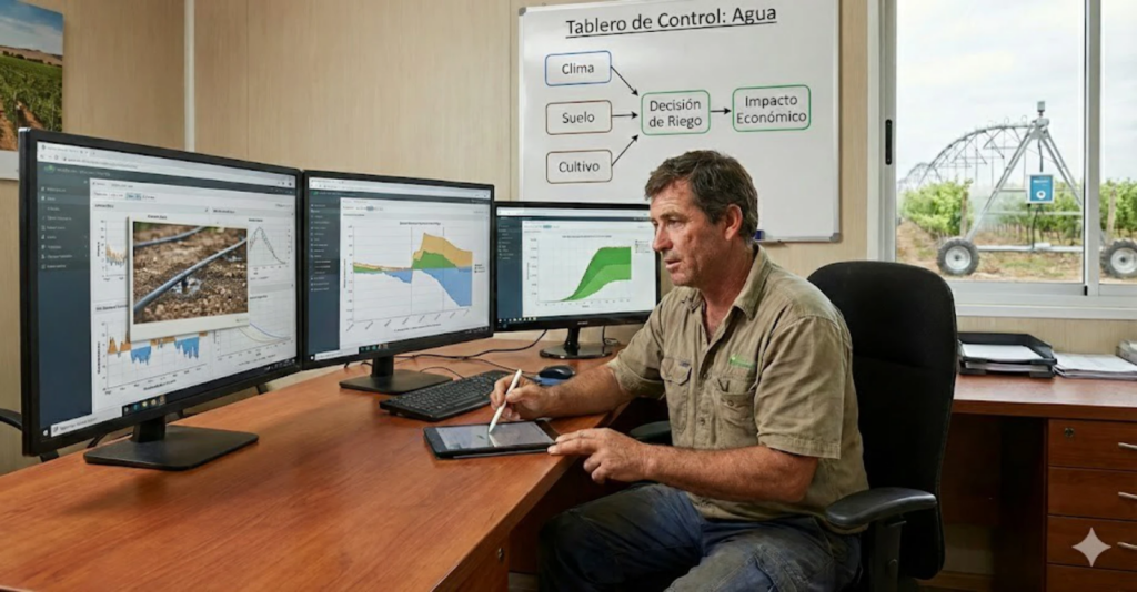 Este productor planifica el riego antes de la campaña, integra información climática, balance hídrico y estado del cultivo, y evalúa el impacto de cada decisión sobre el resultado económico. El agua deja de ser una variable reactiva y pasa a formar parte del tablero de control del sistema productivo.
