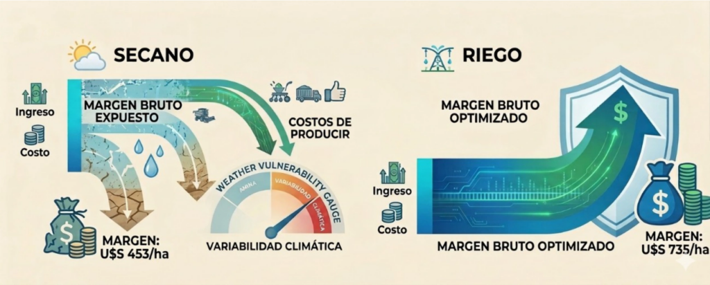 En secano, el margen está completamente expuesto a la variabilidad climática. Bajo riego, no solo es mayor, sino más estable. Y esa estabilidad tiene implicancias económicas profundas: