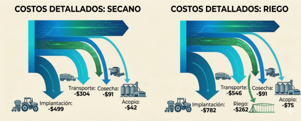 Ahora bien, es importante aclarar que esa diferencia del 62% corresponde a un escenario promedio, ya que en años secos, donde el margen en secano puede volverse negativo, la brecha deja de ser comparable en términos porcentuales. Es allí donde radica el mayor cambio: el riego no solo incrementa el resultado, sino que transforma pérdidas en resultados positivos.