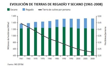 mientras la superficie cultivada total en el mundo se ha mantenido prácticamente constante en las últimas décadas (1.400 millones de hectareas), el crecimiento demografico hizo que la cantidad de tierra disponible por persona ha caído casi a la mitad (linea Negra). En ese contexto, el riego gana protagonismo como estrategia indispensable: su superficie crece sostenidamente (area azul) y ocupa un rol cada vez más importante frente a un modelo de secano que ya no alcanza para abastecer la demanda.