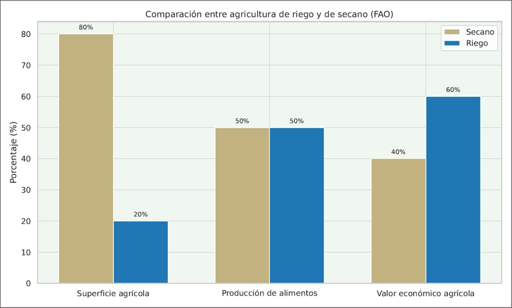 El riego constituye uno de los pilares más importantes para la producción de alimentos en el mundo. Según datos de la FAO (Organización de las Naciones Unidas para la Alimentación y la Agricultura las tierras irrigadas representan solo el 20% de la superficie agrícola mundial, pero generan aproximadamente el 50% de la producción global de alimentos, y hasta el 60 % del valor económico bruto agrícola mundial. Esto implica que el valor generado por hectárea irrigada puede ser 3 a 4 veces mayor que el de secano.